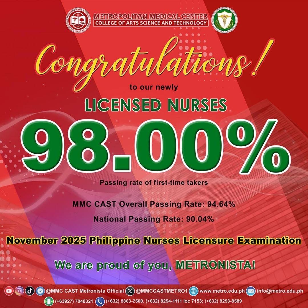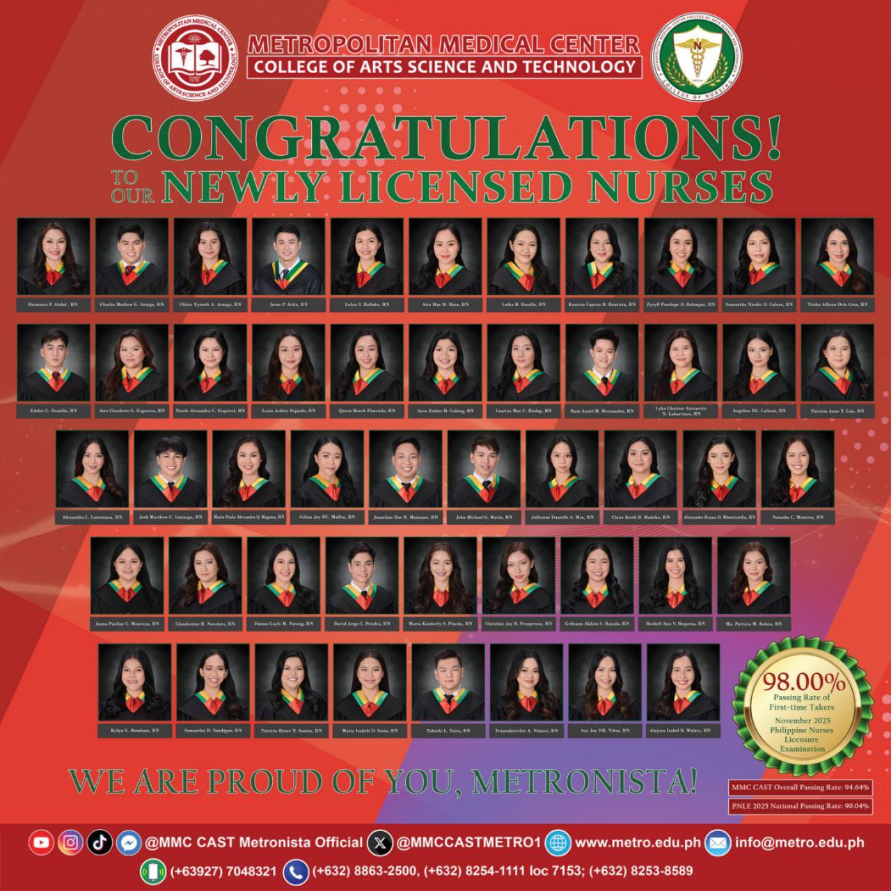 CONGRATULATIONS, OUR NEWLY LICENSED METRONISTA NURSES! Your remarkable success in the November 2025 Philippine Nurses Licensure Examination is a powerful testament to your dedication, resilience, and commitment to the calling of caring for others. As the legacy of future-proof and