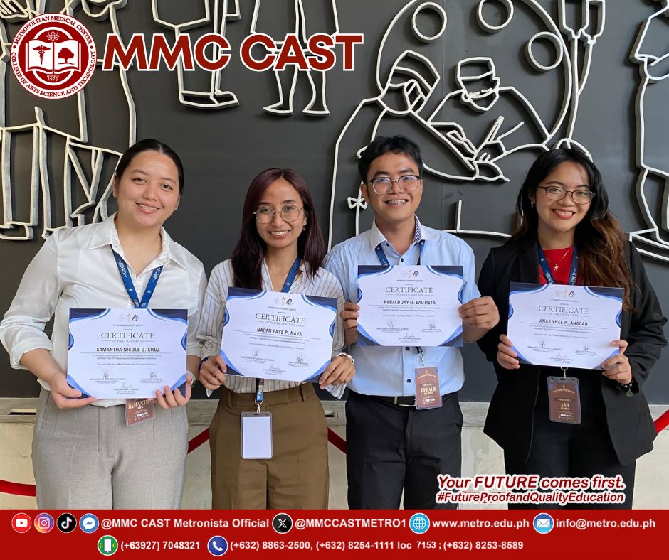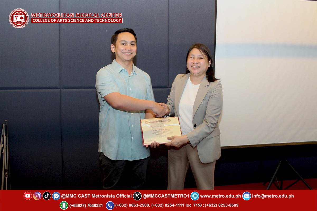 Congratulations, Dr. Socorro Milagros C. Alcancia! The Metropolitan Medical Center College of Arts, Science, and Technology (MMC CAST) proudly congratulates Dr. Socorro Milagros C. Alcancia, Head of the Office of Student Affairs, for her remarkable achievement in successfully presenting her