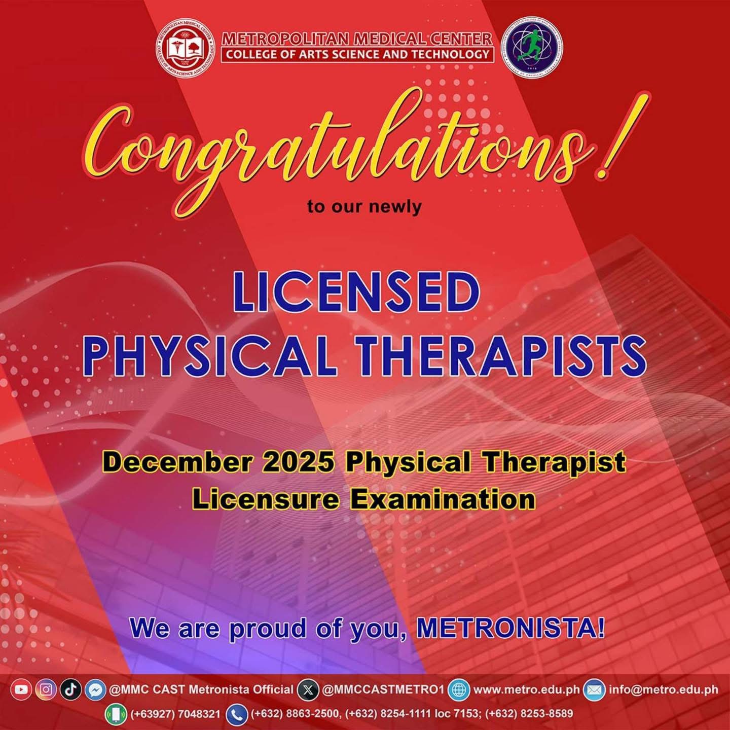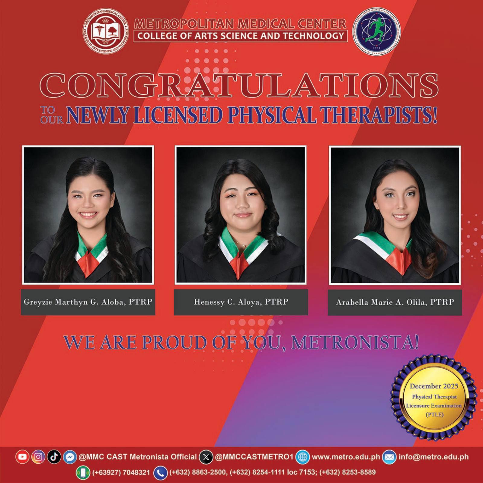 CONGRATULATIONS TO OUR NEW METRONISTA PHYSICAL THERAPISTS! We proudly celebrate our MMC CAST Physical Therapy graduates for successfully passing the December 2025 Physical Therapist Licensure Examination (PTLE)! Your hard work, discipline, and commitment have brought you to this proud moment.