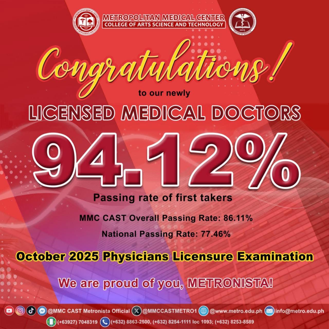CONGRATULATIONS, NEWLY LICENSED MEDICAL DOCTORS! The Metropolitan Medical Center College of Arts, Science, and Technology (MMC CAST) proudly celebrates the remarkable achievement of our new Metronista Physicians for their outstanding performance in the October 2025 Physicians Licensure Examination! Passing Rate