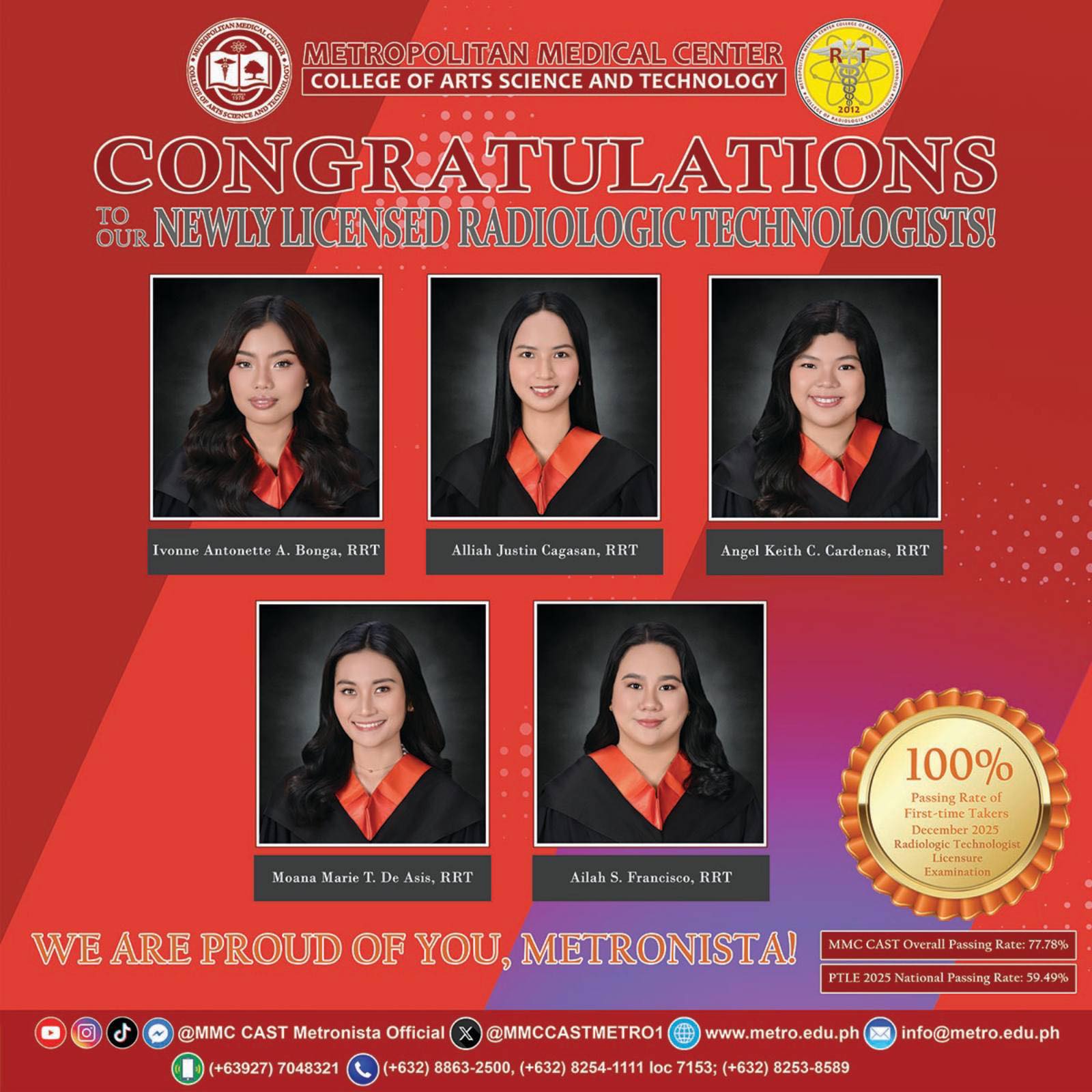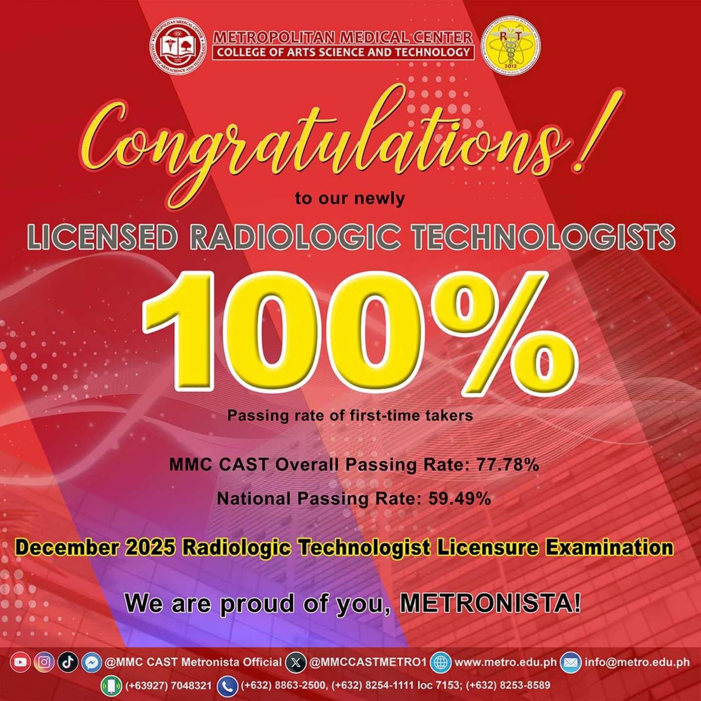 Congratulations to our newly licensed Metronista Radiologic Technologists for their outstanding performance in the December 2025 Radiologic Technologist Licensure Examination! Achieving a 100% passing rate among first-time takers, with an overall institutional passing rate of 77.78%, MMC CAST College of