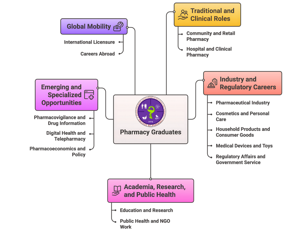 Graduates are prepared to build careers in community and hospital pharmacy, pharmaceutical manufacturing, regulatory affairs, academia, public health, cosmetics, medical devices, household products, and emerging digital health sectors. Many of our alumni work in hospitals, local pharmacies, or pursue entrepreneurship by starting their own drugstores.